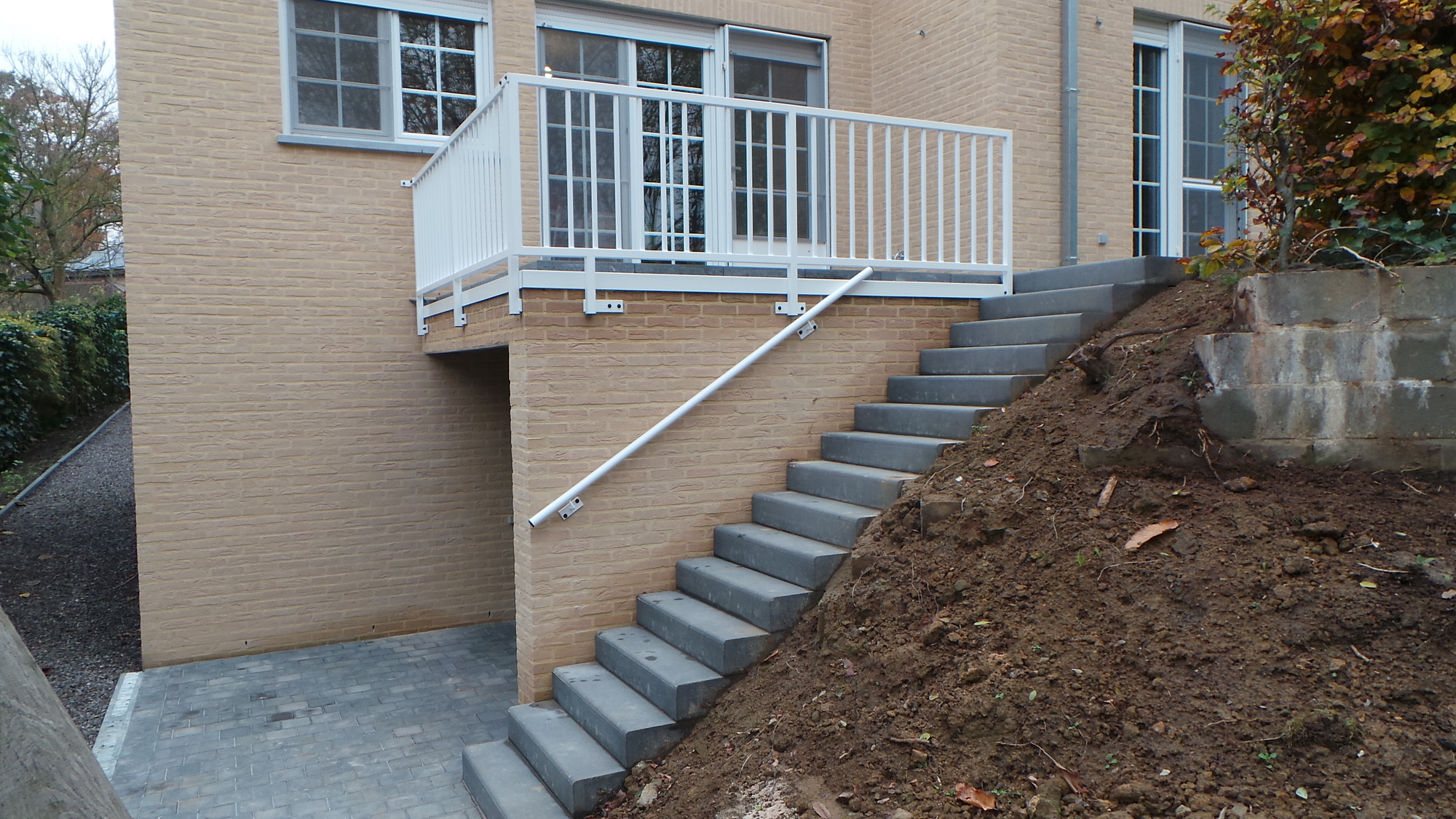 Balustrade met verticale spijlen en handgreep tegen de muur.