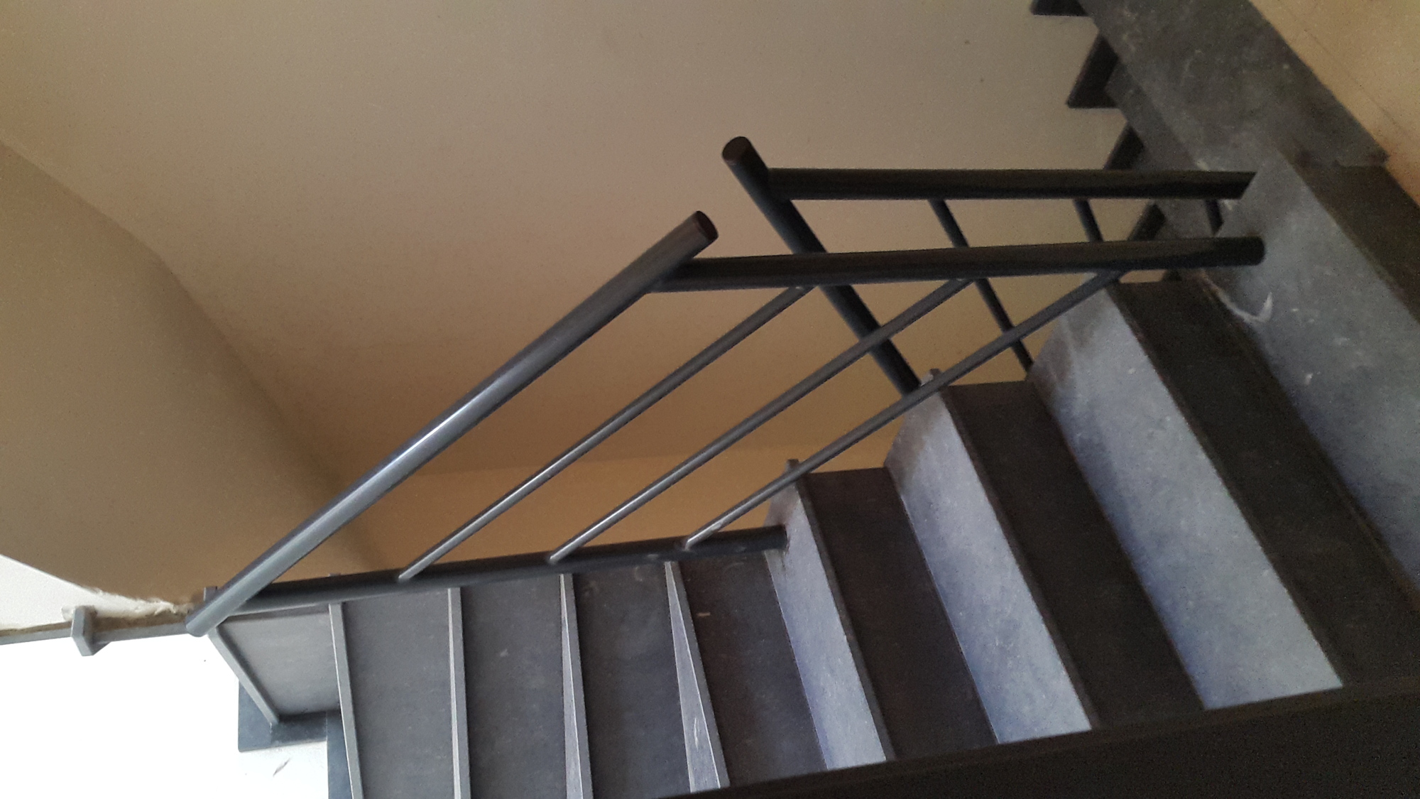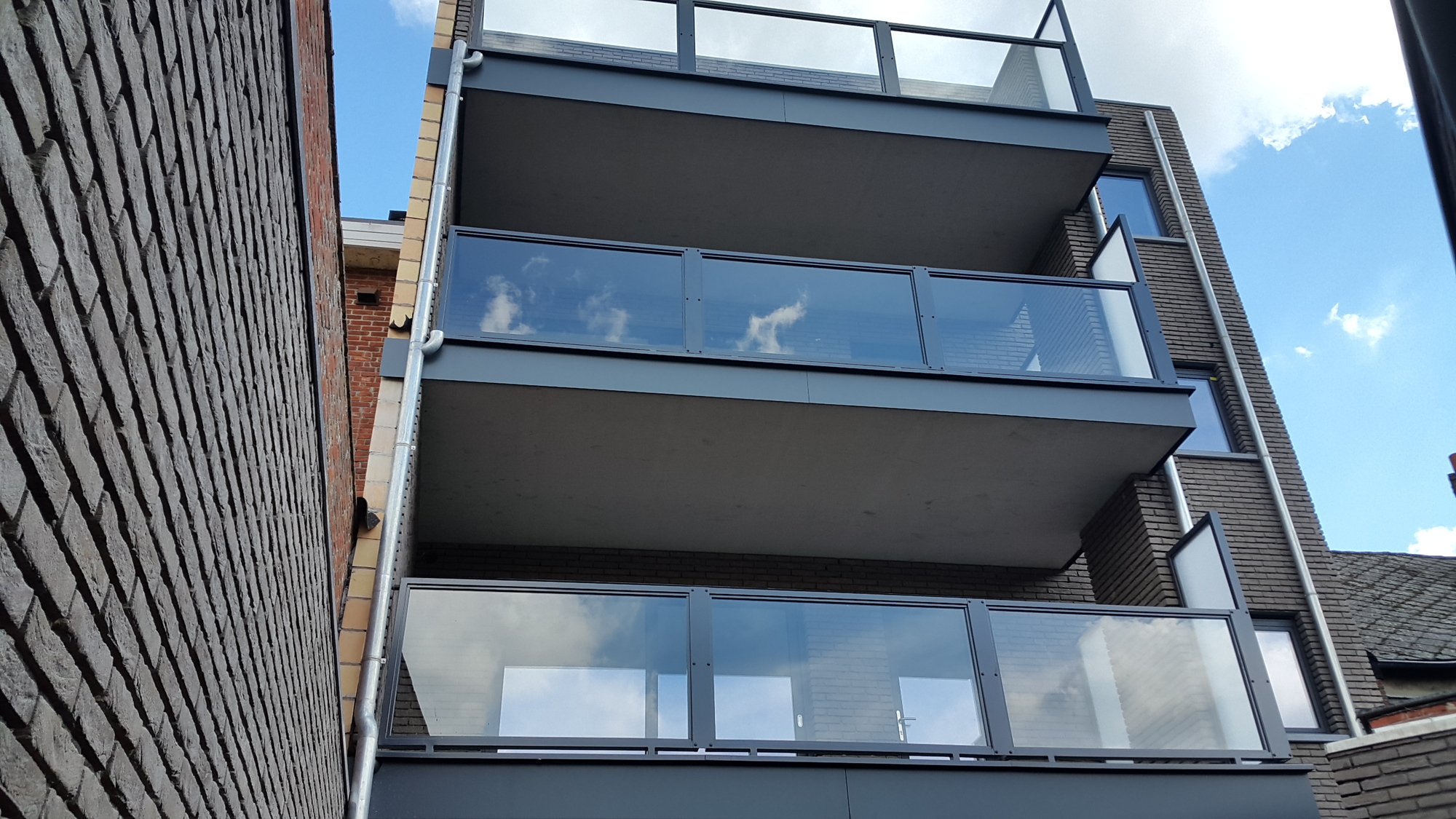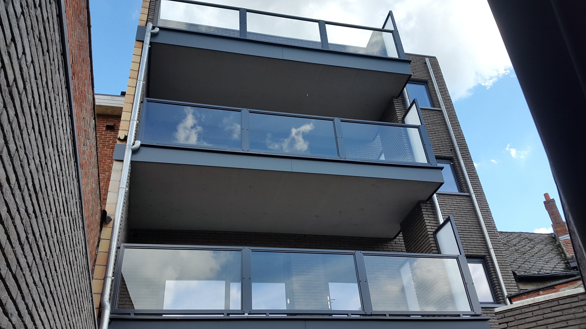 Appartementsgebouw voorzien van balustrades met glas, trapleuningen binnen en brievenbussen.