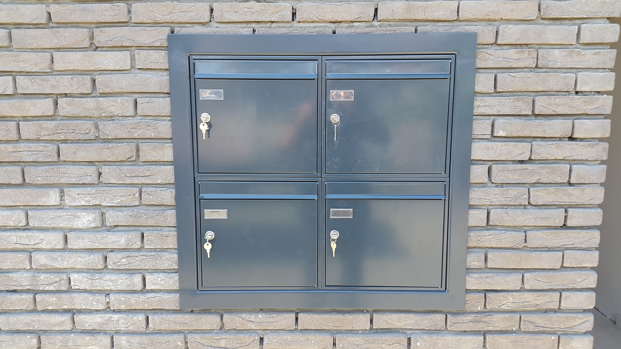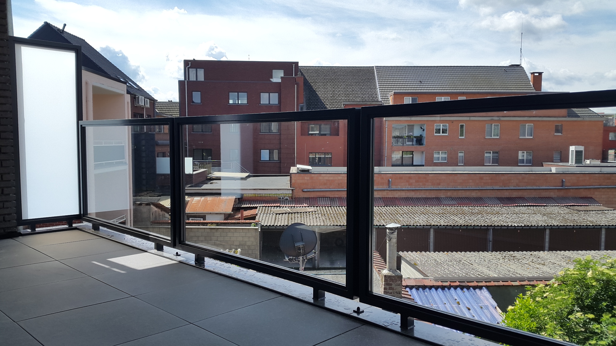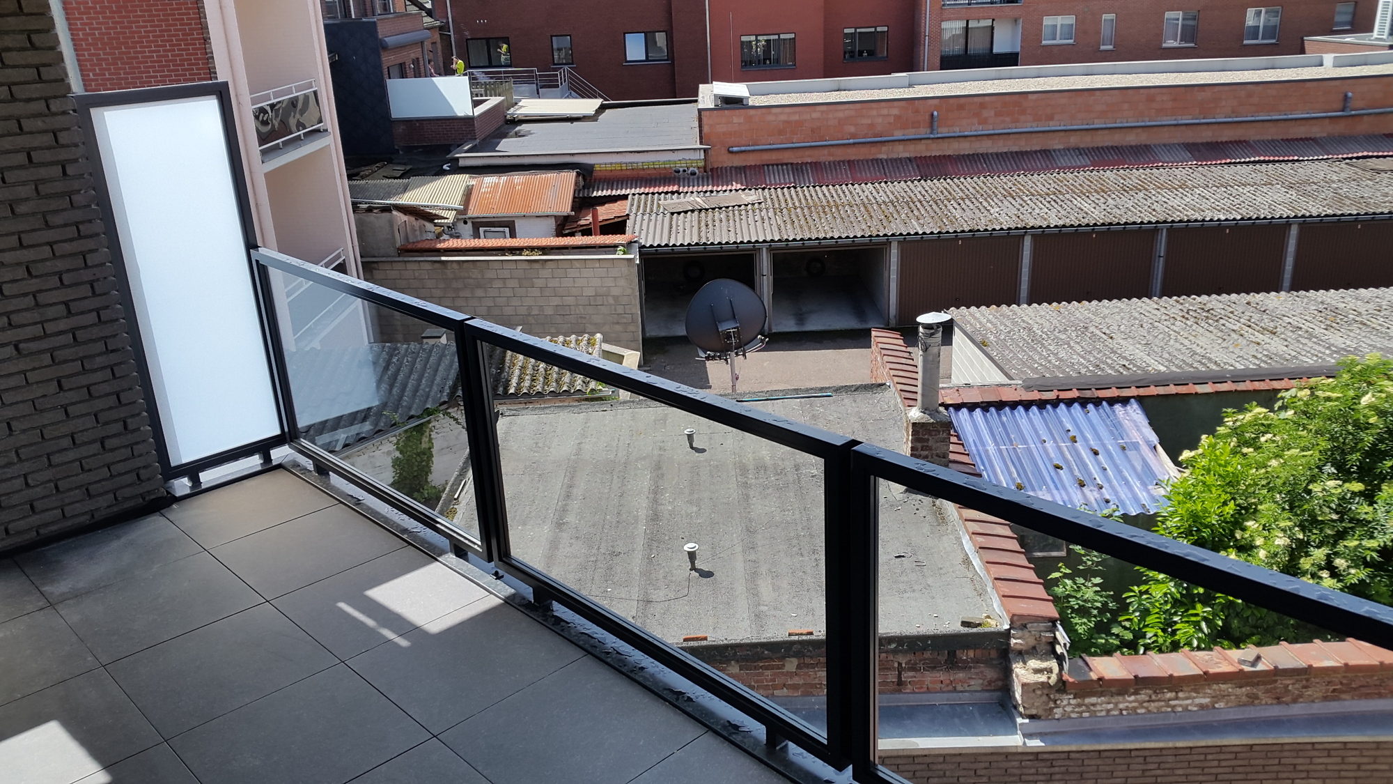Appartementsgebouw voorzien van balustrades met glas, trapleuningen binnen en brievenbussen.