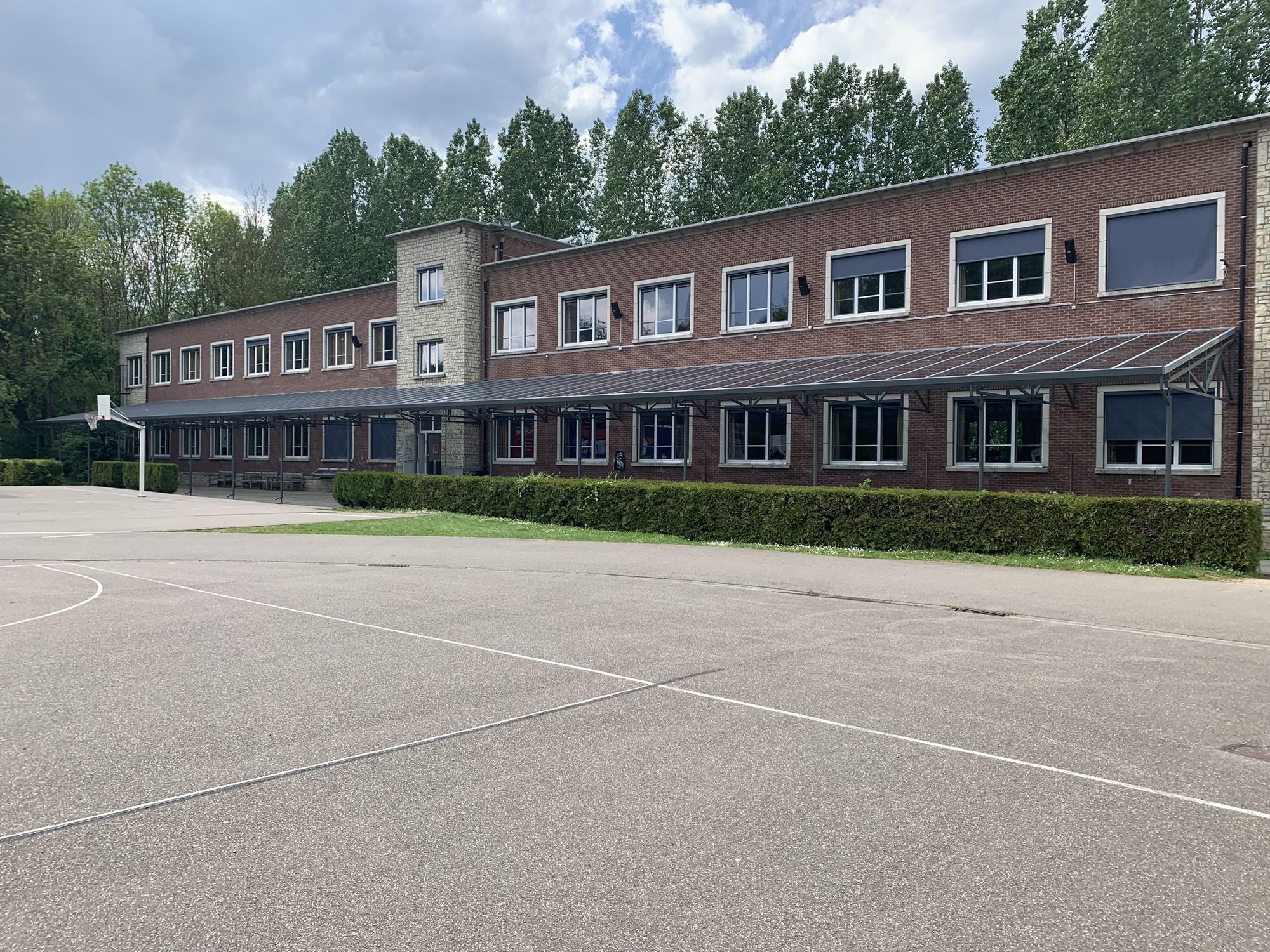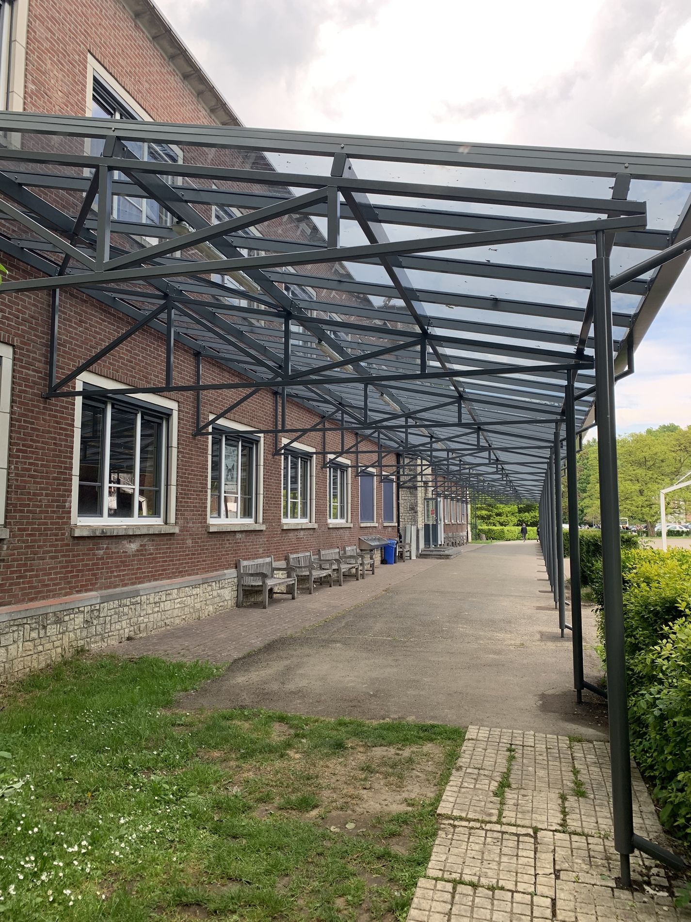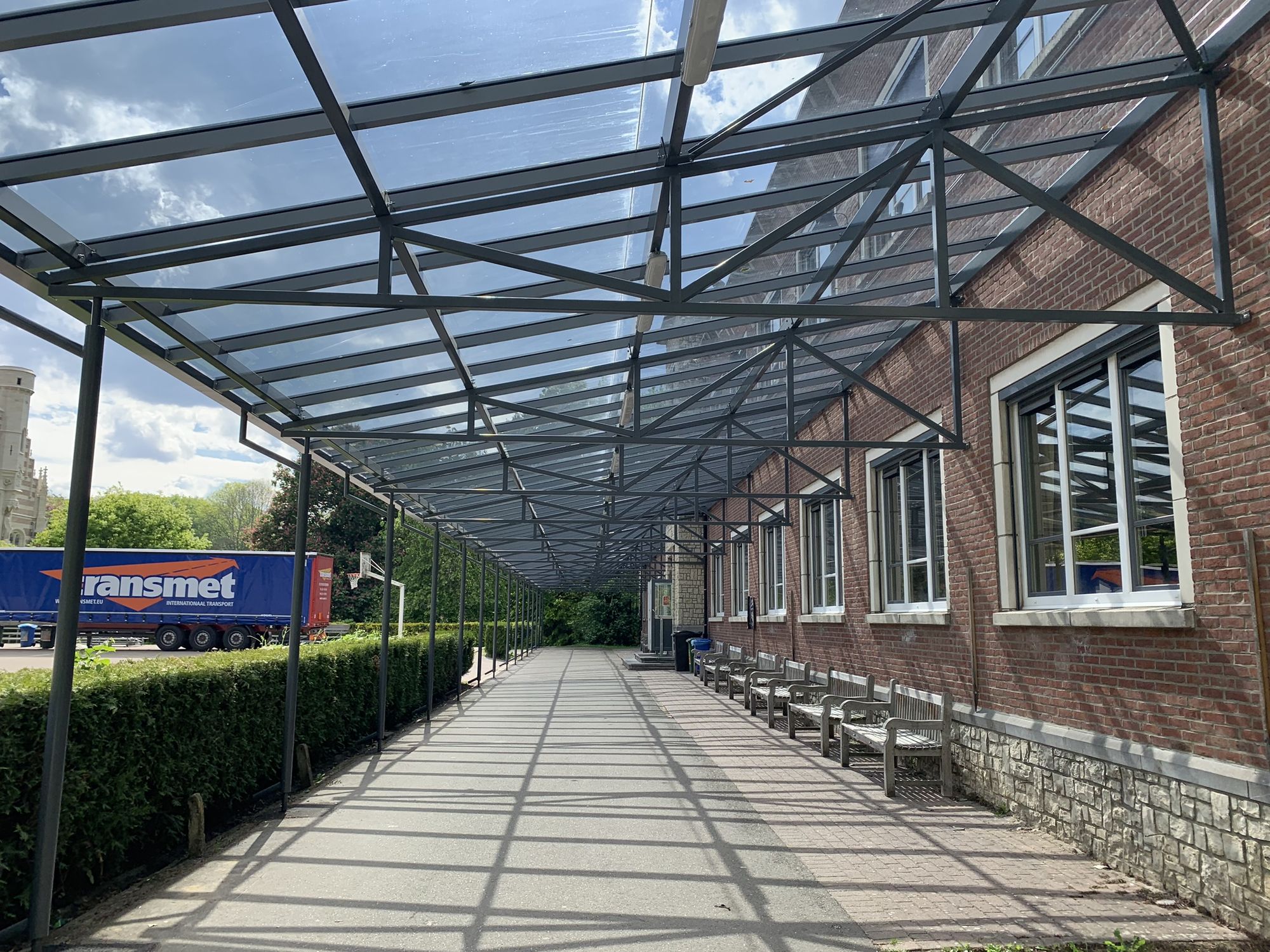 Mooie grote overkapping mogen voorzien aan een school. Met op het dak gekleurd veiligheidsglas.