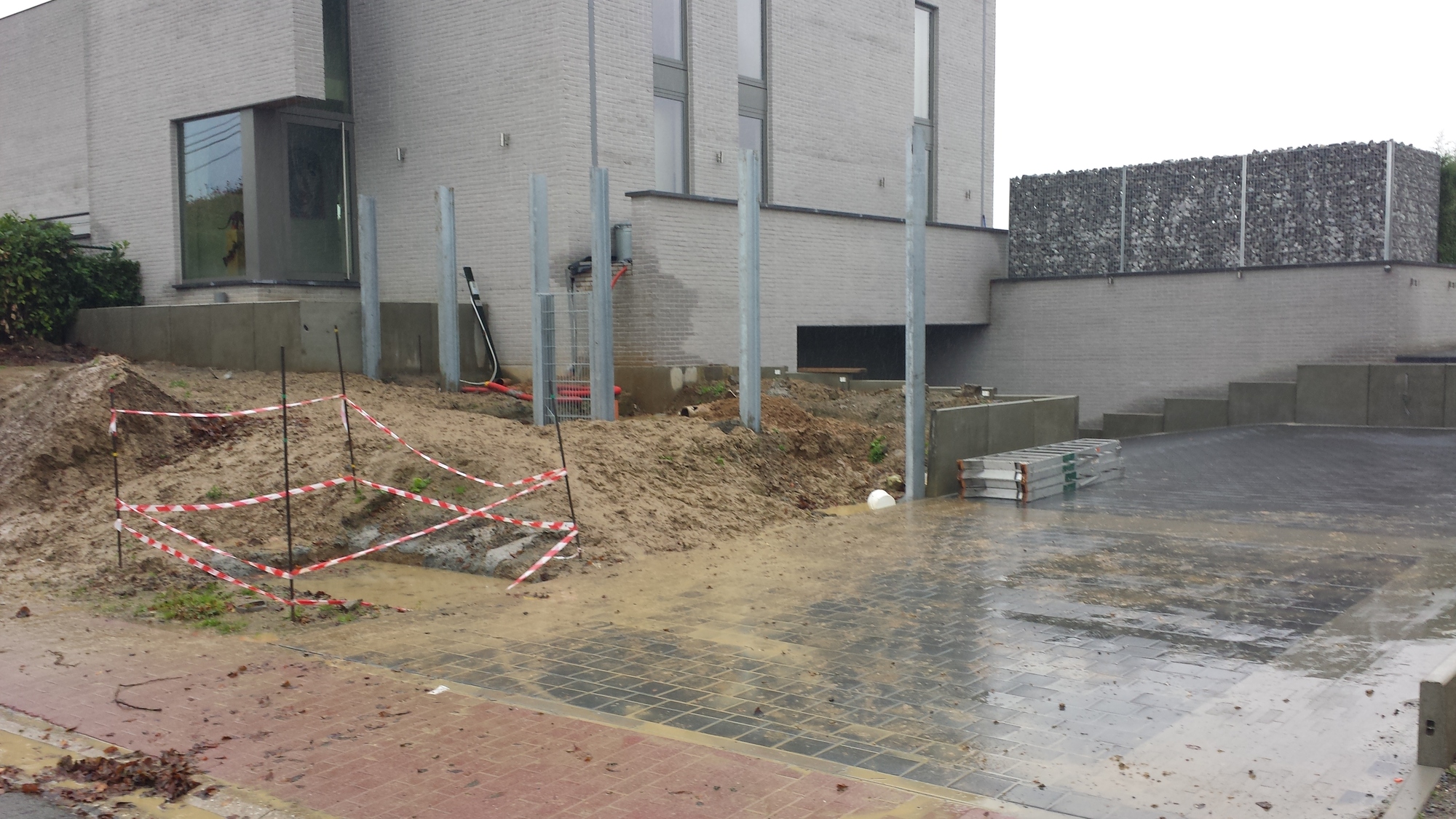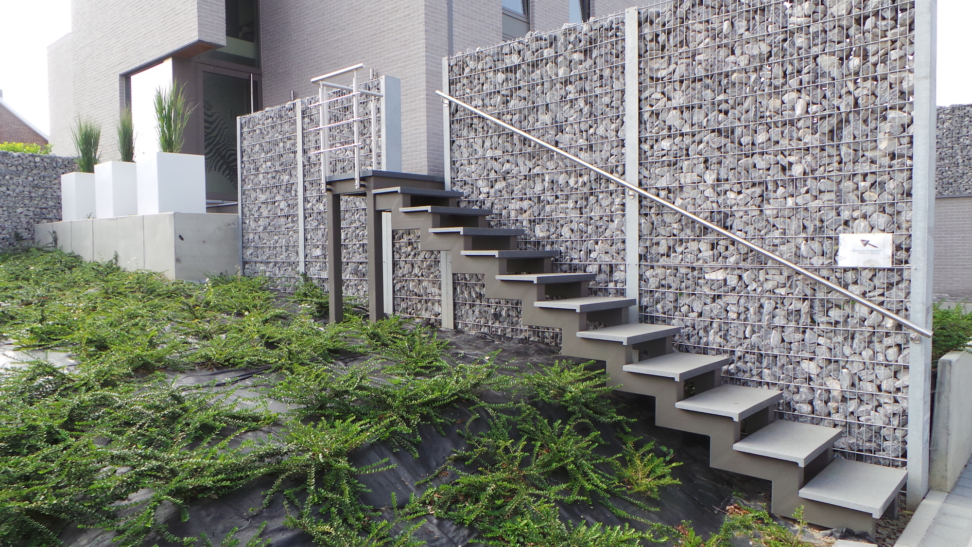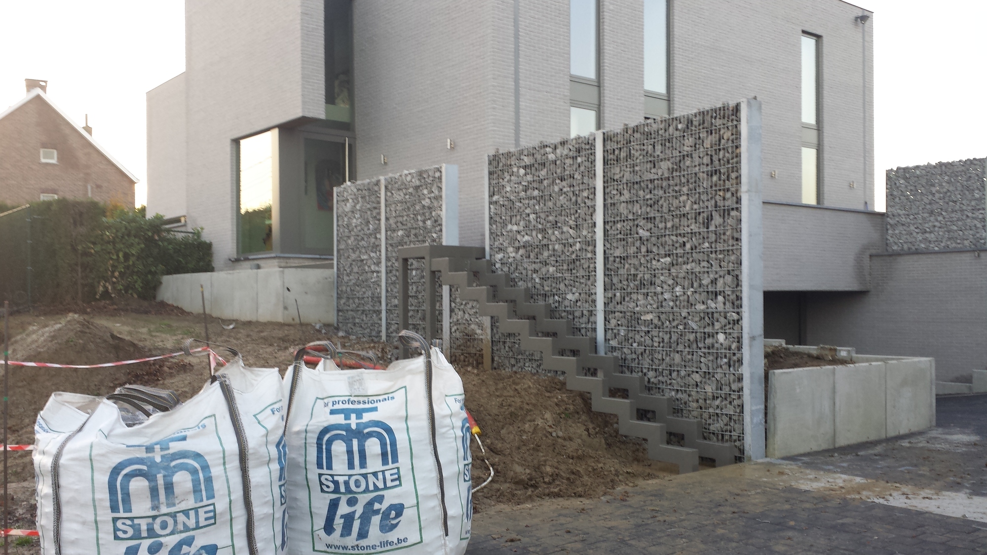 Hij wou echter een strakke en eigentijdse trap, we zijn gaan samenzitten en zijn zo tot dit uniek geheel gekomen. Een stone wall tot 4m hoogte op het hoogste punt, met een trap langs en door de muur uit op gewerkt, waarna deze verder gaat richting voordeur.