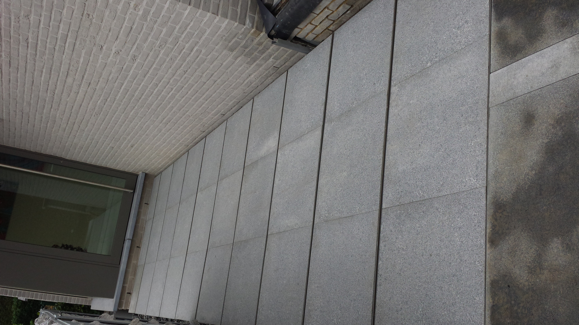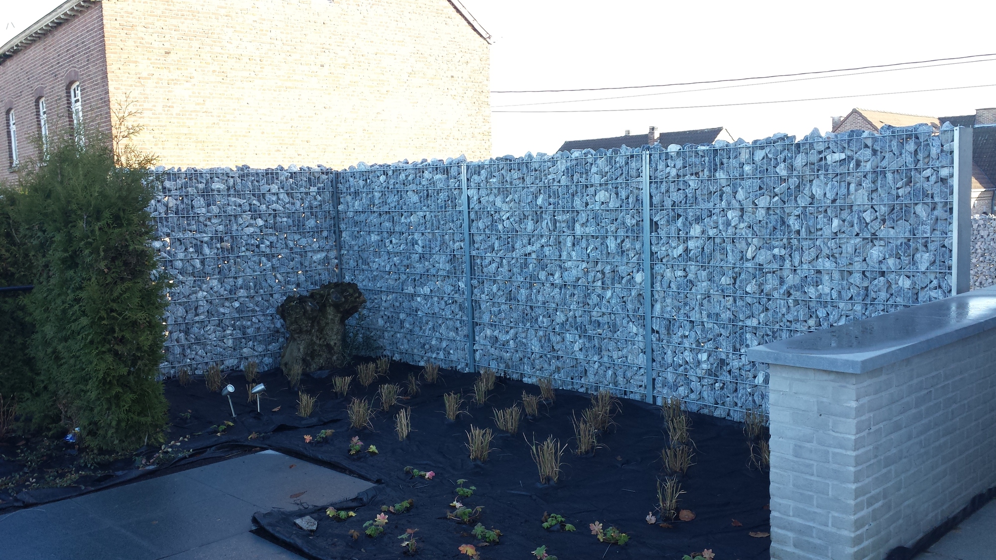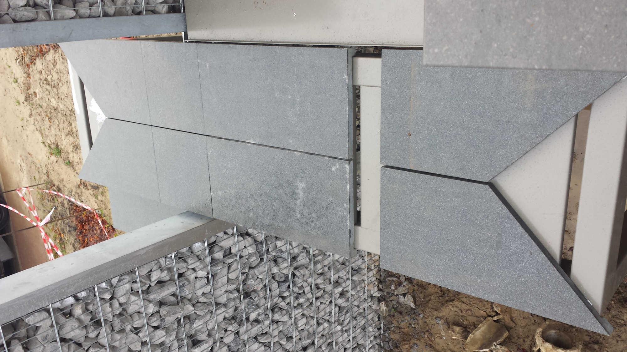 Hij wou echter een strakke en eigentijdse trap, we zijn gaan samenzitten en zijn zo tot dit uniek geheel gekomen. Een stone wall tot 4m hoogte op het hoogste punt, met een trap langs en door de muur uit op gewerkt, waarna deze verder gaat richting voordeur.
